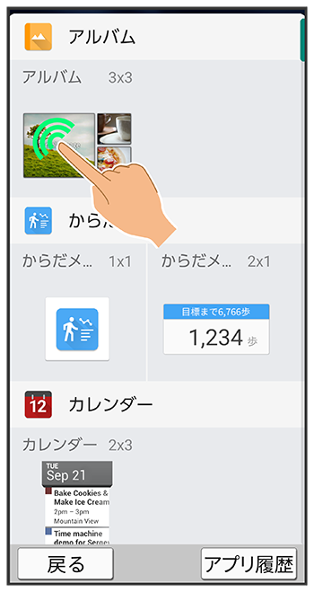 | アルバム | 本機のカメラで撮ったり、内部ストレージやSDカードに保存した写真や動画などを確認できます。 |