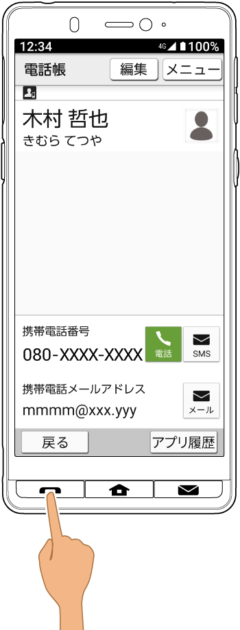 - 選択中の索引を再度タップすると、行内の文字(「あ行」のときは「あいうえお」)が表示されます。隠れている電話帳がある場合、文字をタップすると、その文字から始まる読みの電話帳が表示されます。
