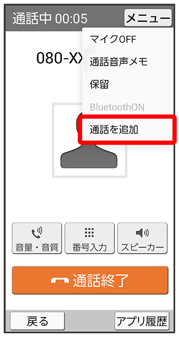 - 電話番号発信画面の通話を追加する履歴をタップしても、通話を追加できます。