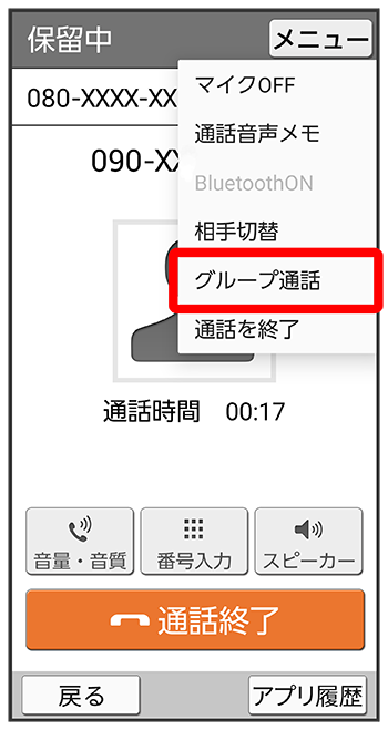 - 電話番号発信画面の通話を追加する連絡先をタップ通話を追加する電話番号をタップしても、通話を追加できます。