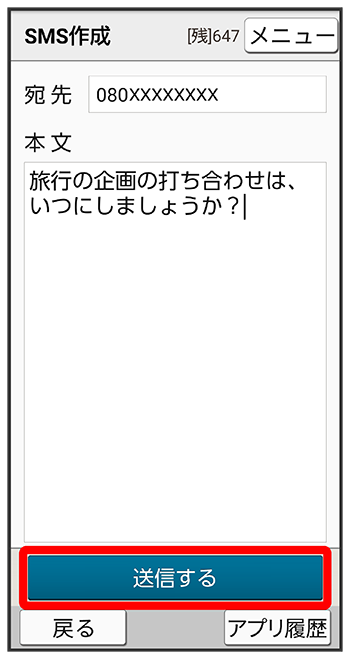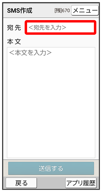 - 送信する宛先を設定したあと、宛先入力欄をタップし、電話番号を削除すると宛先を削除できます。