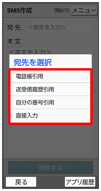 - /をタップすると、電話帳/送信履歴/受信履歴から宛先を選択できます。