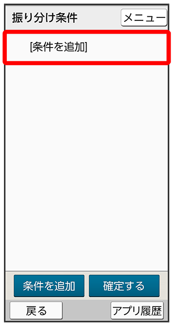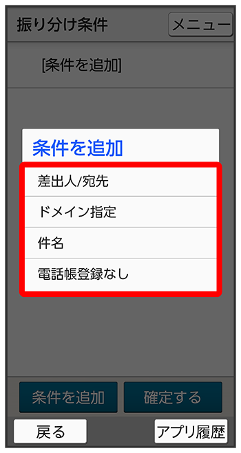 - 振り分け条件を削除するには、振り分け条件画面で削除したい条件をタップして、をタップします。以降は画面に従って操作してください。