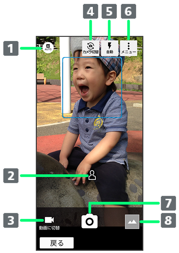 撮影モード(AIオートモード/背景ぼかしモード)を切り替えます。詳しくは「写真を撮る」を参照してください。 - 認識アイコン1