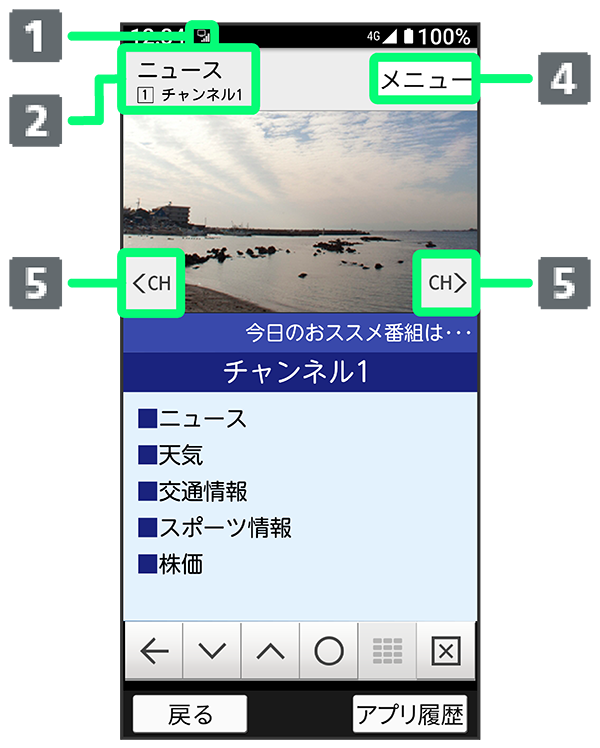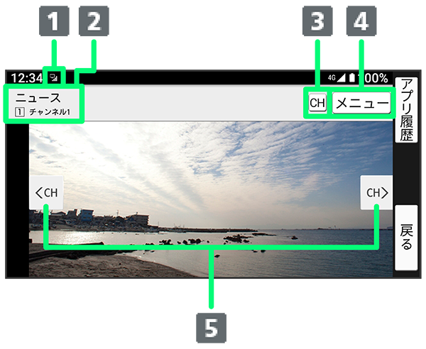 - 画面左上の番組名などが表示されていないときは、テレビ視聴画面の映像部分をタップします。