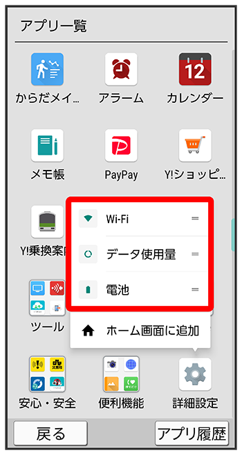 アプリをロングタッチすると、アプリにより機能へのショートカットが表示される場合があります。機能ショートカットをタップすると、その機能を直接起動できます。