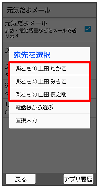 - 登録する相手は、楽ともリンクや電話帳に登録しておくと便利です。ここでは、楽ともリンクに登録済みの相手を、送信相手に登録する操作を例に説明します(この場合は、必ず楽ともリンクの「メール宛先アドレス」を登録しておいてください)。