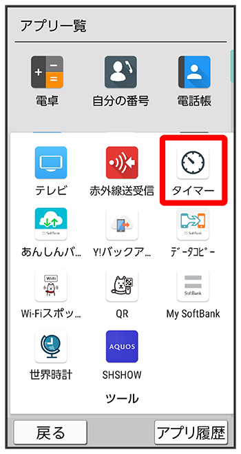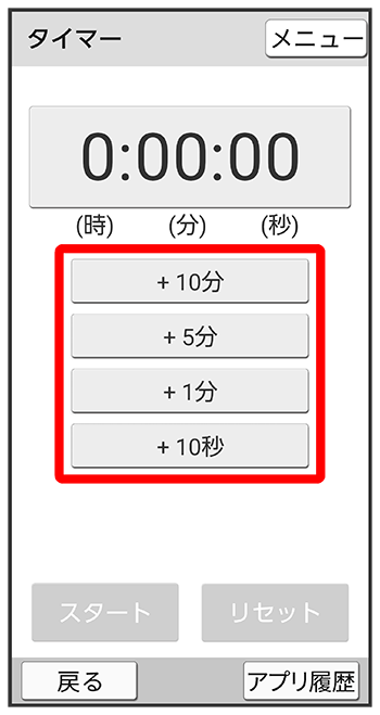 - 設定時間が経過すると、アラーム音やバイブレータでお知らせします。をタップすると、止まります。