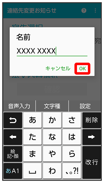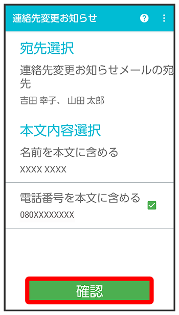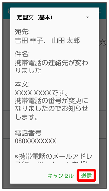 - /をタップすると、本文に電話番号/Gmailアドレスを記載するかどうかを設定できます。タップするたびに、有効(