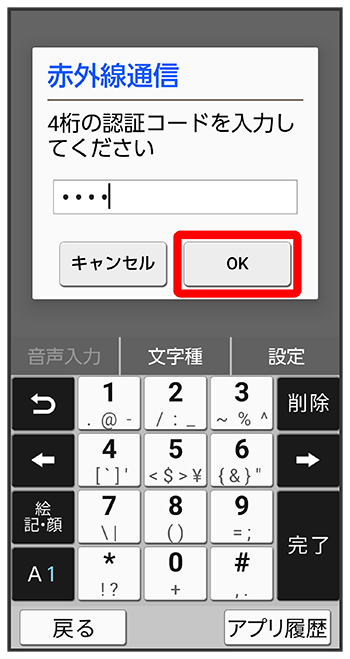 - 認証コードは、正しい通信相手かどうかをお互いに確認するための暗証番号です。送信側/受信側で同じ数字(4桁)を入力します。特に決まった数字ではなく、その通信限りのものです。