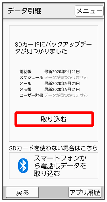 ほかの機器や本機でSDカードに保存したデータ(電話帳、スケジュール、メール、メモ帳、ユーザー辞書/学習辞書を、本機に取り込むことができます。
