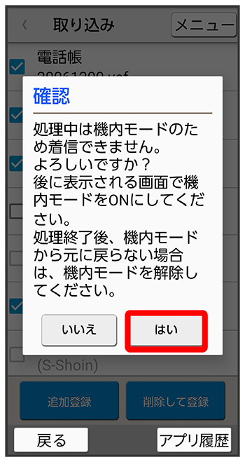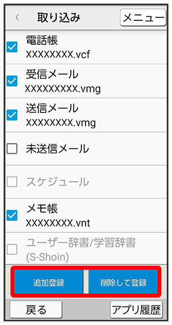 ユーザー辞書/学習辞書(S-Shoin)を取り込む場合、内部ストレージに保存されているユーザー辞書/学習辞書(S-Shoin)のデータが削除されますのでご注意ください。
