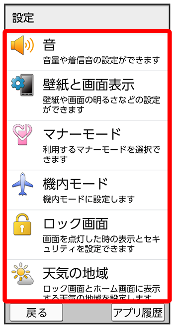 | 壁紙と画面表示 | 壁紙や画面の明るさなどが設定できます。 |