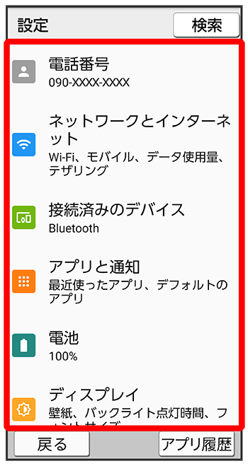 | ネットワークとインターネット | Wi-Fiやモバイルネットワーク、テザリングなど、ネットワークやインターネットに関する設定ができます。 |