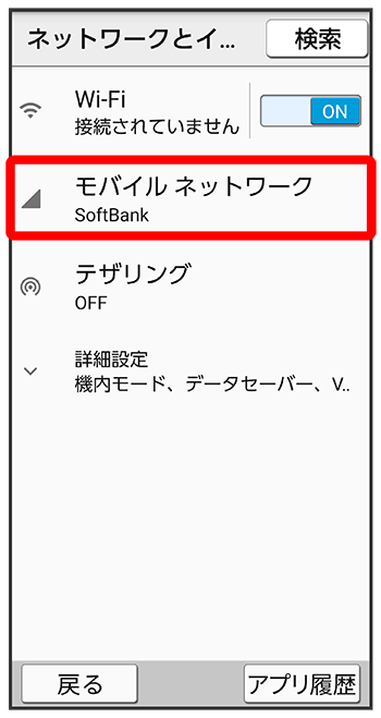 が表示され、モバイルデータ通信を無効にした案内が表示されます。このときは、画面に従って操作してください。