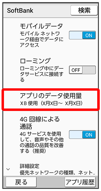 モバイルデータ使用量画面でアプリ名をタップ- をタップするたびに、有効(