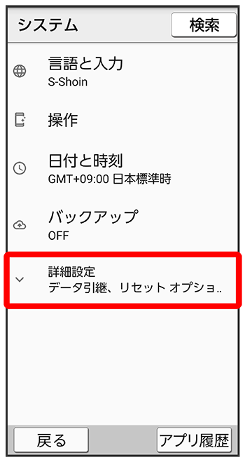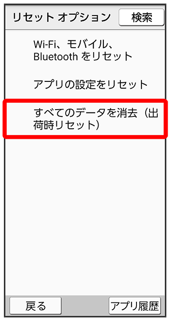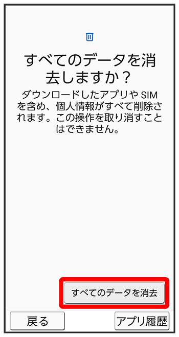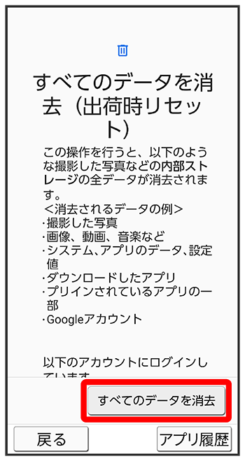 - すべてのデータを消去(出荷時リセット)を行うと、内部ストレージのデータがすべて消去されます。必要なデータは事前にバックアップをとることをおすすめします。