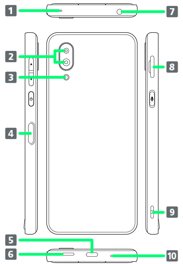 | 送話口/マイク | 本機を耳に当てて通話するときに使用します。動画撮影時や音声認識時はマイクとして利用します。 利用時は送話口/マイクをふさがないようご注意ください。 |