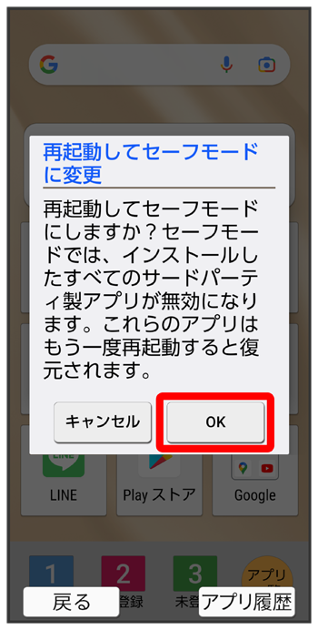 - セーフモード中は、機内モードに設定されます。セーフモードを解除しても、機内モードの設定が維持されますのでご注意ください。