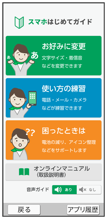 スマホはじめてガイドは、スマホでよく使う機能の練習や、基本的な設定をかんたんに行うことができます。