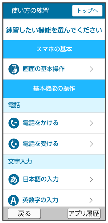 「使い方の練習」では、スマホでよく使う基本的な機能を、実際の画面で練習することができます。