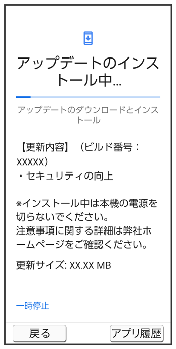 - システムアップデート中も他の機能を使用できます。ただし、システムアップデートの通知後10日間は、システムアップデート中に他の機能を使用していると、アップデートのインストールが一時的に停止されます。をタップすると、インストールが再開され、他の機能も使用可能になります。
