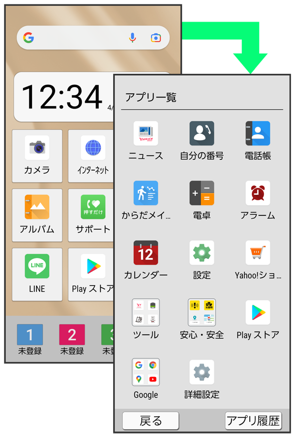 本機のおもな操作は「ホーム画面」と、アプリを一覧表示した「アプリ一覧画面」から行います。ホーム画面は、本機の操作の中心となる画面です。ホーム画面には、よく使うアプリや登録した相手に簡単に電話やメールで連絡ができる「楽ともリンク」が配置されています。ホーム画面でをタップすると、アプリ一覧画面が表示されます。アプリ一覧画面は、アプリを起動したり、本機の設定変更などを行ったりすることができます。