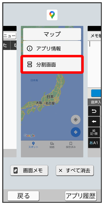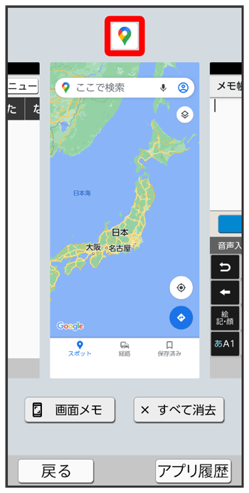 マルチウインドウ画面下に表示されたアプリの履歴一覧から、次に操作したいアプリをタップ