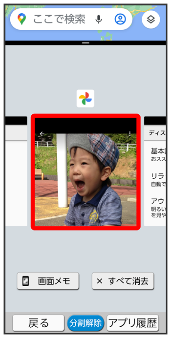 マルチウインドウ画面が表示され、選択したアプリが画面上部に表示されます。