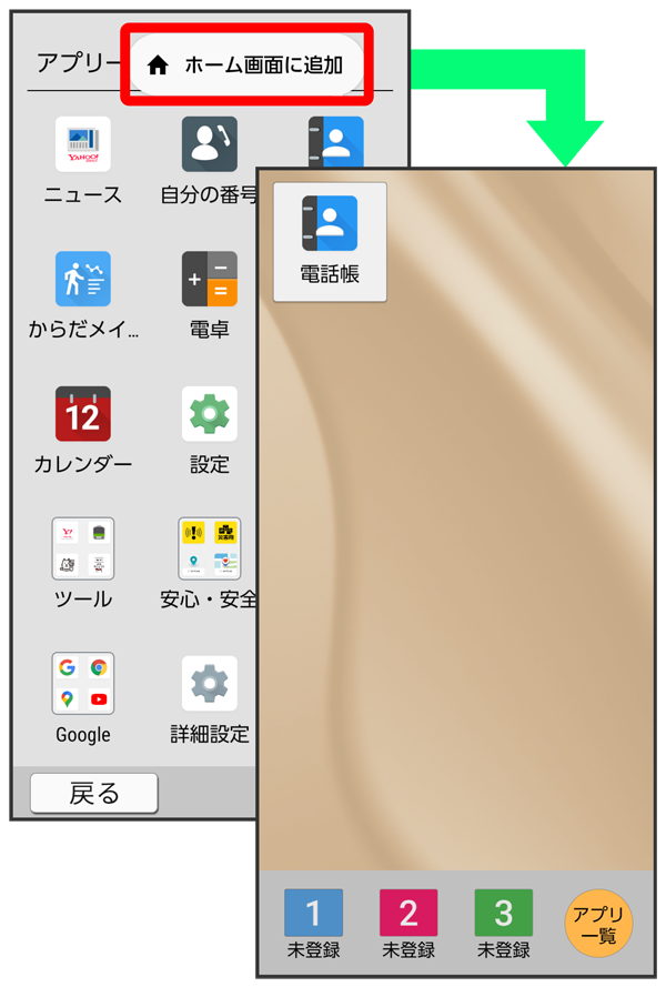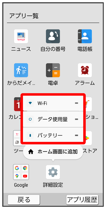 アプリをロングタッチすると、アプリにより機能へのショートカットが表示される場合があります。機能ショートカットをロングタッチし、ホーム画面の追加したい位置で指を離すと、機能へのショートカットとして追加することができます。