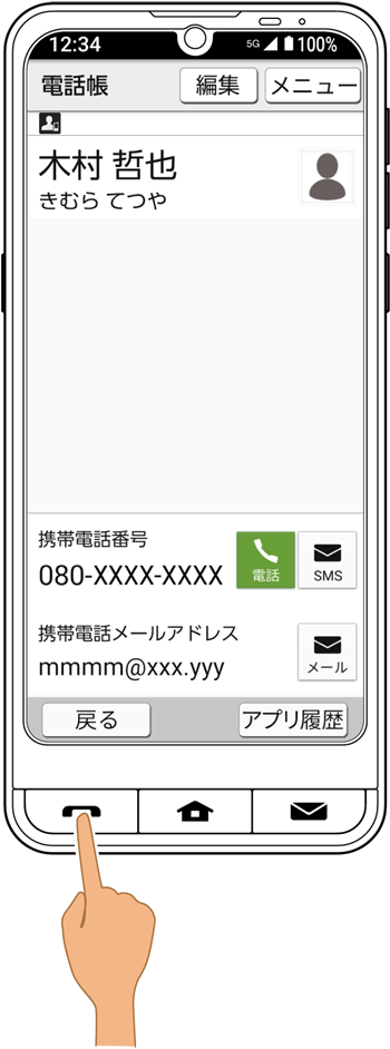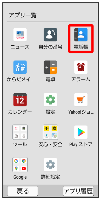 - 選択中の索引を再度タップすると、行内の文字(「あ行」のときは「あいうえお」)が表示されます。隠れている電話帳がある場合、文字をタップすると、その文字から始まる読みの電話帳が表示されます。
