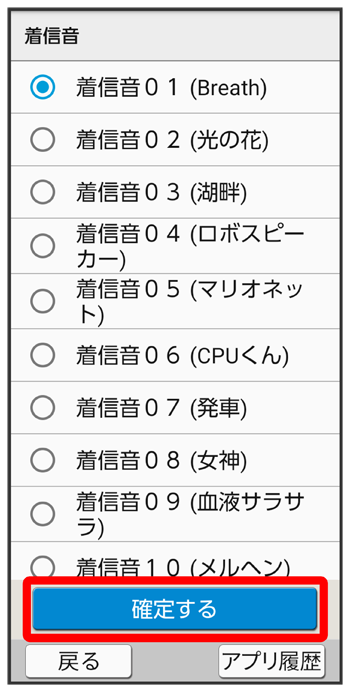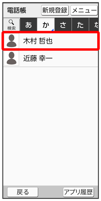 - 選択中の索引を再度タップすると、行内の文字(「あ行」のときは「あいうえお」)が表示されます。隠れている電話帳がある場合、文字をタップすると、その文字から始まる読みの電話帳が表示されます。