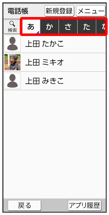 - 選択中の索引を再度タップすると、行内の文字(「あ行」のときは「あいうえお」)が表示されます。隠れている電話帳がある場合、文字をタップすると、その文字から始まる読みの電話帳が表示されます。