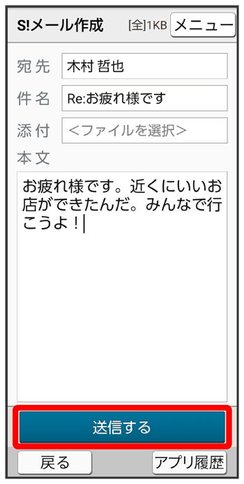 S!メール詳細画面で本文入力欄をタップ本文を入力