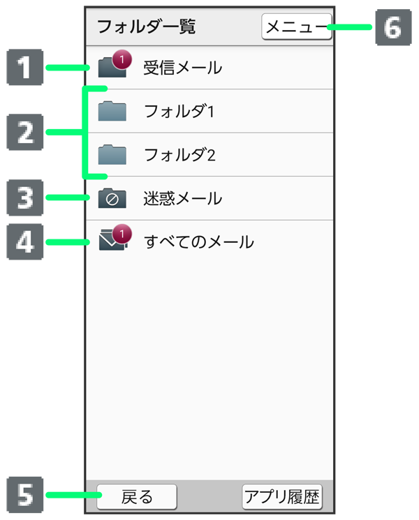 - 受信メールフォルダ内のメール一覧画面を表示