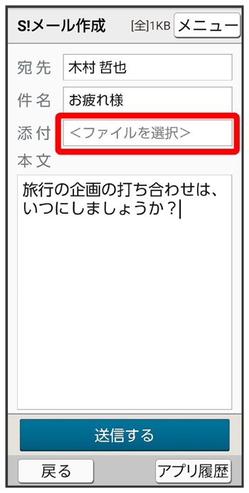 S!メール作成画面で、添付ファイル選択欄をタップ