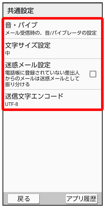 | 音・バイブ | 新着メール受信時の着信音やバイブレーターを設定します。 |