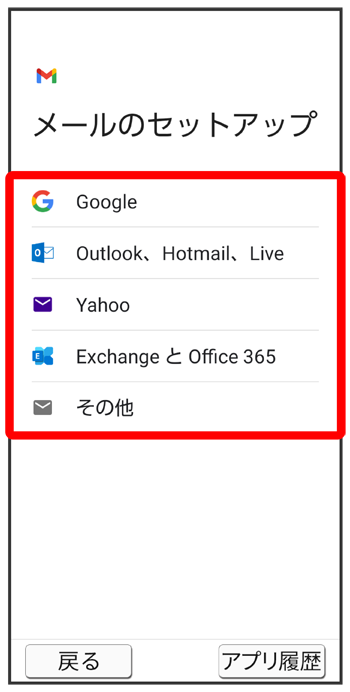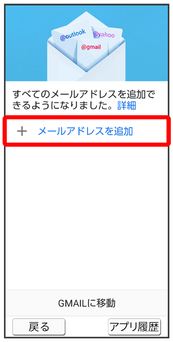 (Gmail)を起動すると、アカウント設定画面が表示され、設定操作を行うことができます。
