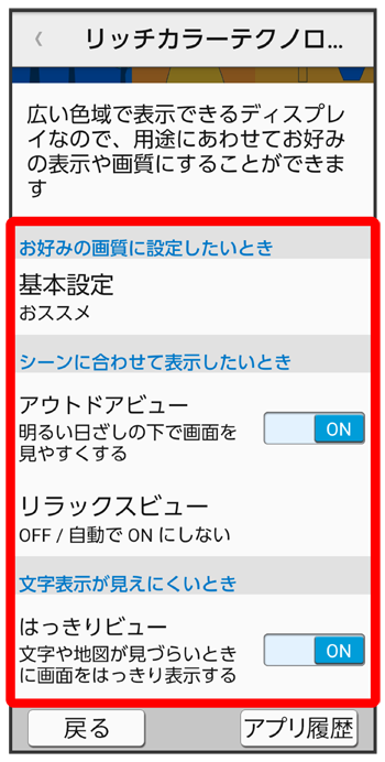 | リラックスビュー | 目にやさしい画質にする機能(リラックスビュー)について設定します。詳しくは、「壁紙と画面表示の設定」を参照してください。 |