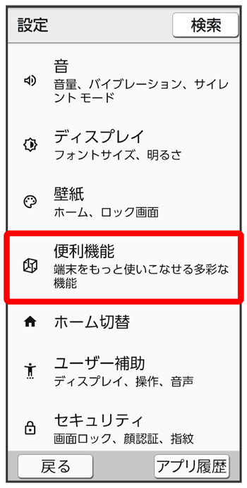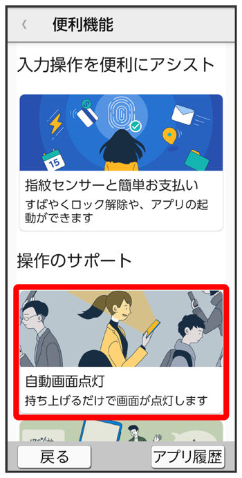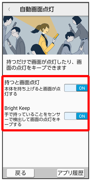 端末を持つだけで画面が点灯したり、画面の点灯をキープしたりするように設定できます。設定できる項目は次のとおりです。
