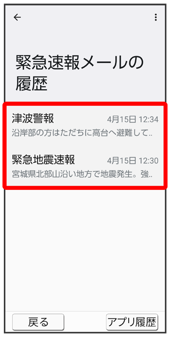 緊急速報メール受信メッセージ一覧画面が表示されます。