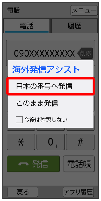 ダイヤルキーをタップして相手の電話番号を入力- 電話番号の先頭には「+」を付けないでください。