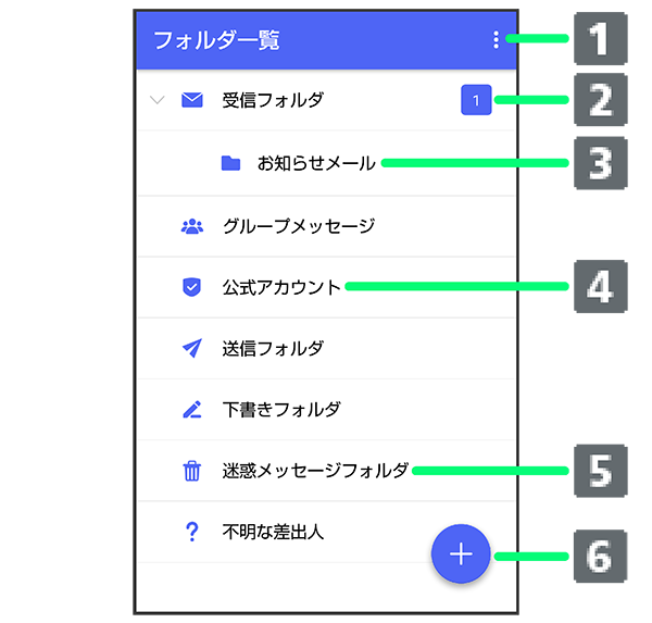 (+メッセージ)起動直後の画面はフォルダ一覧画面になります。フォルダ形式への切り替え方法について詳しくは、「フォルダ形式の表示に切り替える」を参照してください。