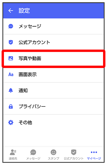 | [モバイルデータ通信時]写真や動画の自動ダウンロード | モバイルデータ通信時に受信した写真や動画を自動でダウンロードするかどうかを設定します。 |