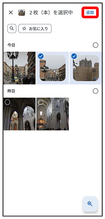 )が切り替わります。 - 写真/動画は複数選択することもできます。
