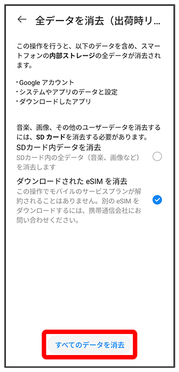 表示)。 - 「ダウンロードされた eSIM を消去」にチェックを入れたままで次に進むと、現在利用しているeSIMが消去されますのでご注意ください。