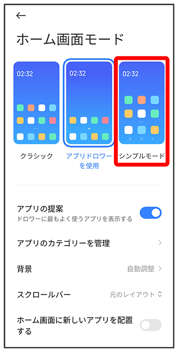 ホーム画面に戻ると、シンプルモードの表示に切り替わります。