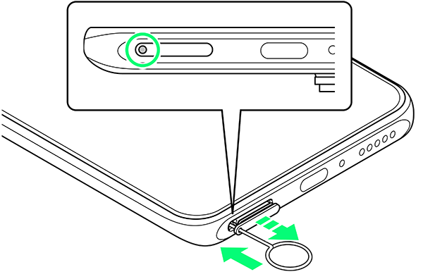 SIM取り出し用ピン(試供品)をトレイ取り出し穴にまっすぐ差し込む