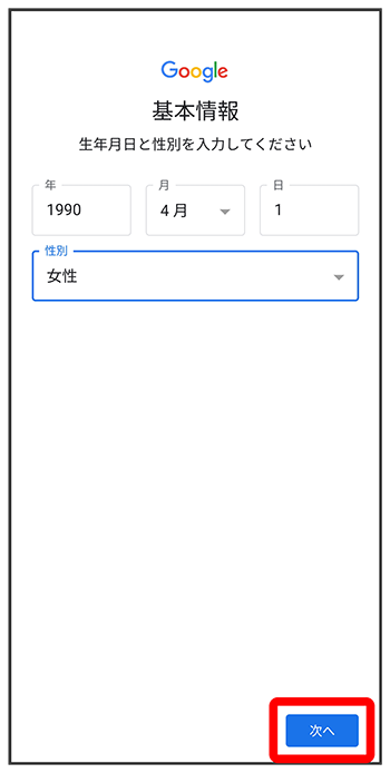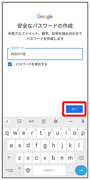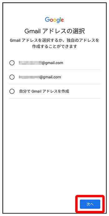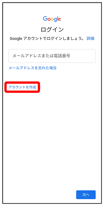 - 自分でGmail アドレスを作成する場合は、ユーザー名(メールアドレス)を入力と操作します。
