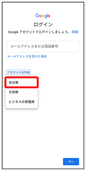 - 子供用/ビジネスの管理用のアカウントを作成する場合は、/をタップして画面の指示に従って操作してください。
